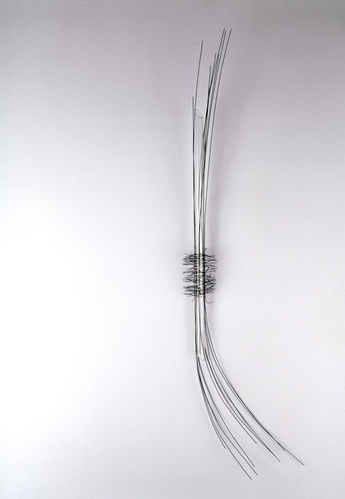 Een cylindrische vorm van boraxcilicaat glas, gecombineerd met een kraag van gebogen metalen draden. De dualiteit van zowel het transparante glas als de donkere metaalstructuur krijgt zo een extra dimensie. Het geheel wordt met een simpele haak aan de muur bevestigd.