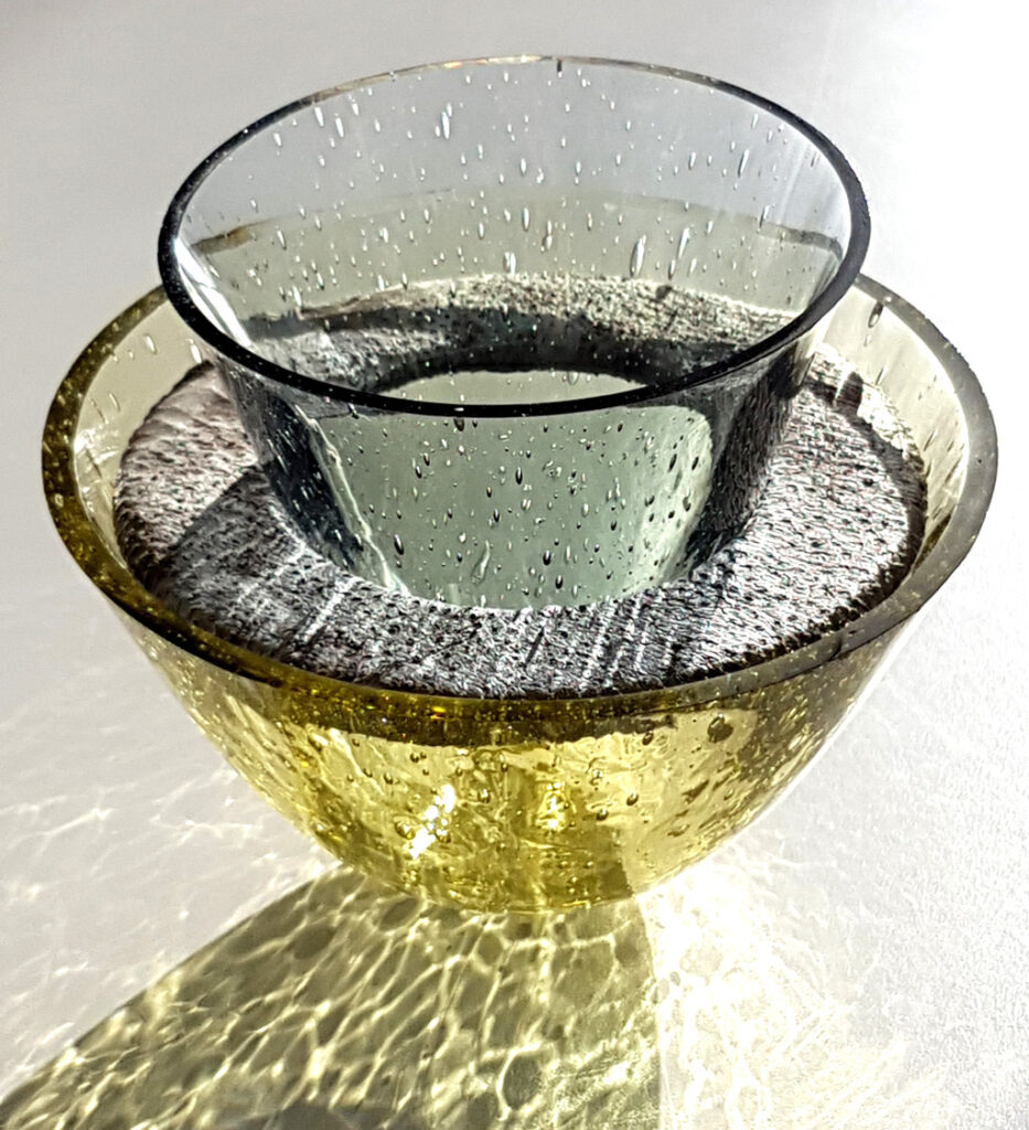 De kommen werden gemaakt met behulp van het smelten (fusen) en door de zwaartekracht uitrekken (slumpen) van een vlakke glasplaat door een drop-ring. De overtollige rand wordt eraf getikt en de overgebleven rand wordt recht geslepen. De ring bestaat uit een harde binnenkant van hout die bekleed is met visleer. Voor dit object is de zeewolf gebruikt.